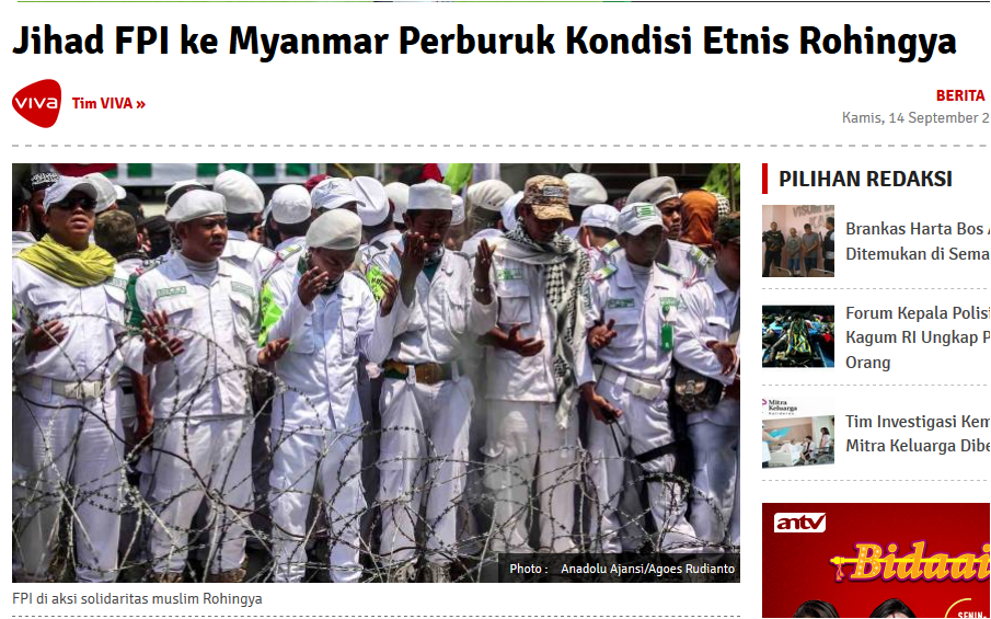Dok. Viva.co.id Tim Pencari Fakta Perserikatan Bangsa-Bangsa (PBB) untuk Kasus Myanmar hingga saat ini belum bisa memasuki wilayah negara bagian Rakhine. Namun beredar kabar bahwa FPI telah mengirim pasukan ke Myanmar. Mulai dengan judul “TAKBIIRR..!! FPI: 10 Miliar untuk...