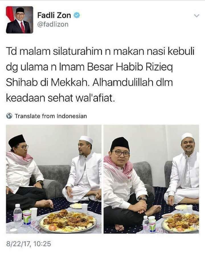 Fadli Zon Temui Rizieq Tersangka Sex Chat di Arab, Jokowi dan Polisi Dipermalukan!