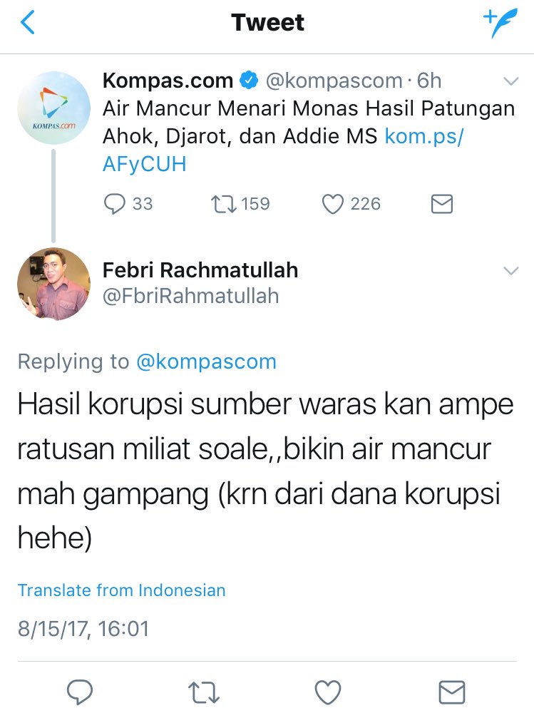 Fitnah Sumbangan Air Mancur Monas Ahok Dari Korupsi Sumber Waras, Netizen Ini Menghilang
