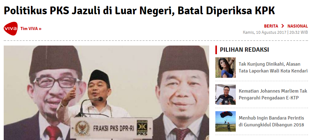 Berita ini sudah keluar dalam laman viva pada tanggal 10 Agustus 2017 2 hari yang lalu, pada link berikut Menurut pelaksana harian Kepala Bagian Pelayanan Informasi dan Komunikasi Publik KPK, Yuyuk Andriati, Jazuli tak bisa memenuhi pemanggilan pemeriksaan dengan...