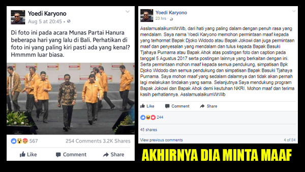 Hari ini, akun media sosial yang bernama Yoedi Karyono dalam link berikut, memohon maaf atas status fitnah yang sempat ia lontarkan di media sosial miliknya pribadi. https://www.facebook.com/ykaryono/posts/2015082925184357 Dalam tulisan tersebut bisa kita lihat bahwa dia sedang menulis “permohonan maaf”...