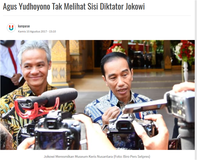 Akhir-akhir ini banyak yang menyebarkan isu bahwa Presiden Joko Widodo seperti diktator. Rata-rata yang mengatakan seperti itu adalah orang-orang yang dulu menyebutnya Presiden klemar-klemer, tidak tegas, dan ndeso. Alasannya Jokowi dianggap ‘mematikan’ demokrasi dengan mengeluarkan Perppu Ormas dan Kemenkominfo...
